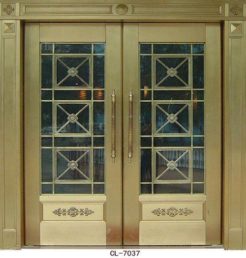 铜门的内部ؓ(f)钢结构骨Ӟ外部包裹加工好的铜面板型材?用于院落外檐的铜门Ş体较大,雍容华贵Q而作为普通公寓的户门虽然体型E小Q却同样富贵气派Q品味不俗。现代拉丝铜门的颜色可以做到q十U。铜门的内部为钢l构骨架Q外部包裹加工好的铜面板型材。易折弯塑性,不易开裂的T2紫铜带是铜门面板非常好的型材Q在铜门中运用较多?br />